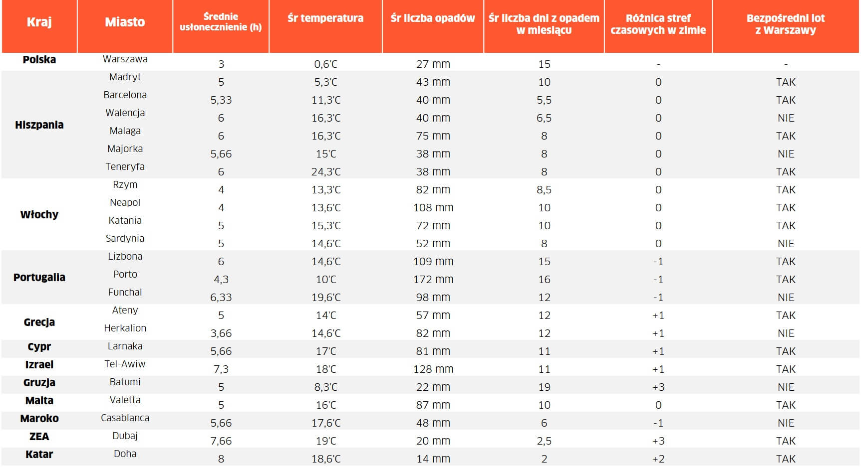 Przede wszystkim chcę brać pod uwagę miasta, do których jest lot bezpośredni z twojego miasta. Mógłbym długo opisywać poszczególne kierunki, ale wydaję mi się, że najlepiej odda je poniższa tabelka. W tabelce znajdziecie dane takie, jak: